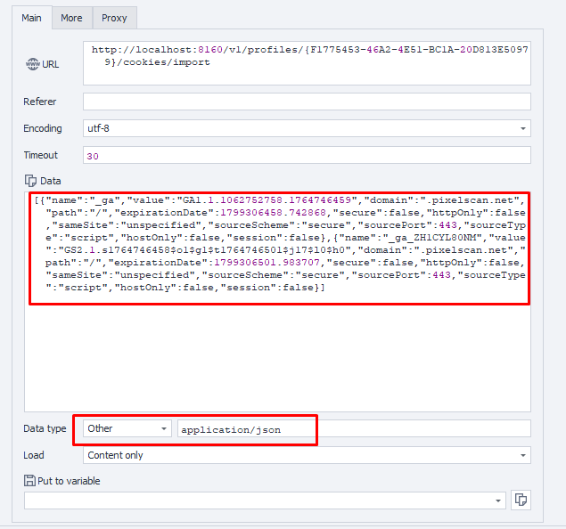 Описание: Этот метод позволяет импортировать файлы cookie в существующий профиль в формате JSON.
